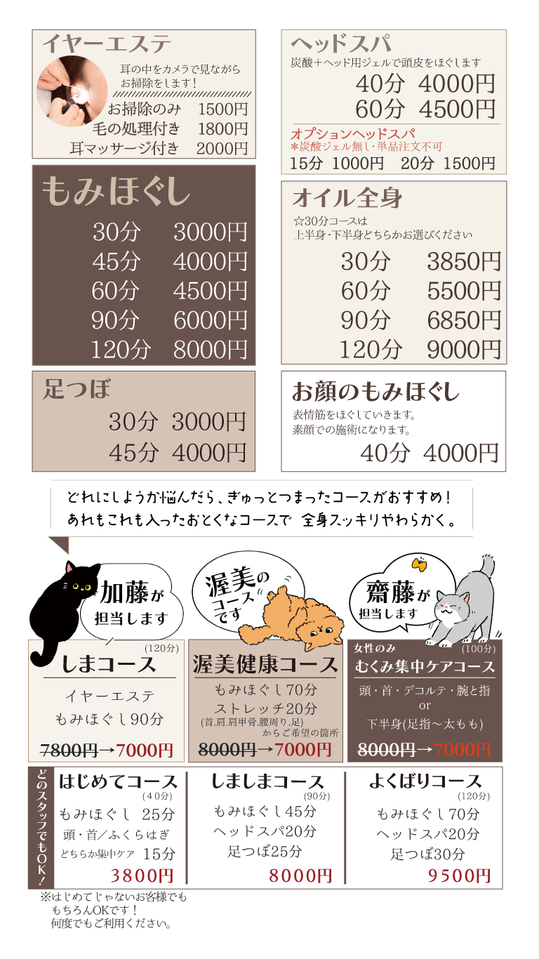 相馬もみほぐし しましま 2018.05.242025.09.30 ご予約・お問い合わせ 080-5595-7090 ※施術中は電話に出ることができません。折り返しの連絡となります、ご了承ください。 営業時間 9:30~21:00 (最終受付20:00) 月曜のみ最終受付16:00 移転のお知らせ いつもしましまをご利用くださりありがとうございます。2025年5月23日より、現在の店舗の3階に移転しました。駐車場からみて北側、スロープのある玄関よりご来店ください。また、玄関はいってすぐ左側にエレベーターがございますのでエレベーターをご利用になり3階までお越しください。 momihogushishimashima \三階に引っ越しました!/ 相馬市にあるもみほぐししましまです! 当日OKです!お気軽にお問い合わせください😊 Instagram 投稿 18011766512773661 #毎年恒例 #相馬野馬追 2025年 GWの営業日ですꪔ̤̮ 29日は お さらに読み込む Instagram でフォロー